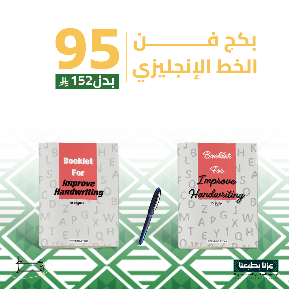 احتفل باليوم الوطني 95 مع متجر "خط القلم" وابدأ تحسين خطك الإنجليزي مع بكج فن الخط الإنجليزي. هذا البكج يشمل مجموعة من الكراسات والأدوات التي تساعدك على تحسين الكتابة اليومية بخطوط إنجليزية دقيقة وأنيقة.